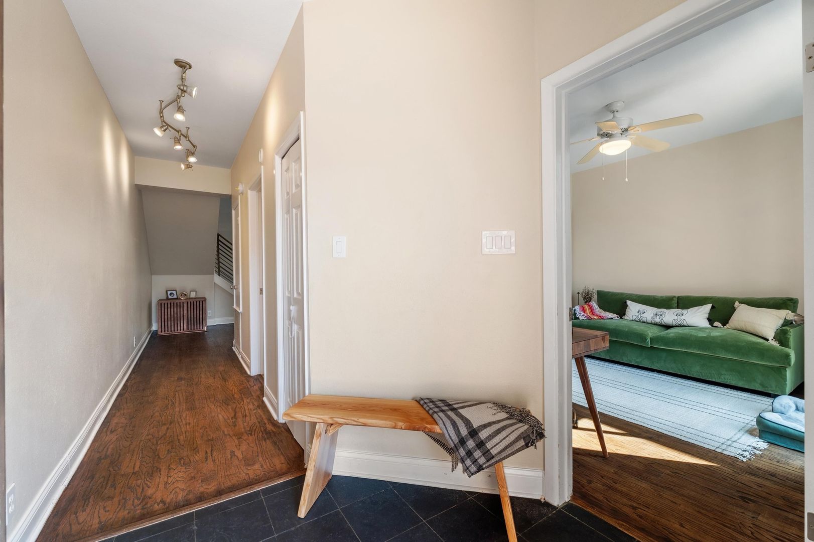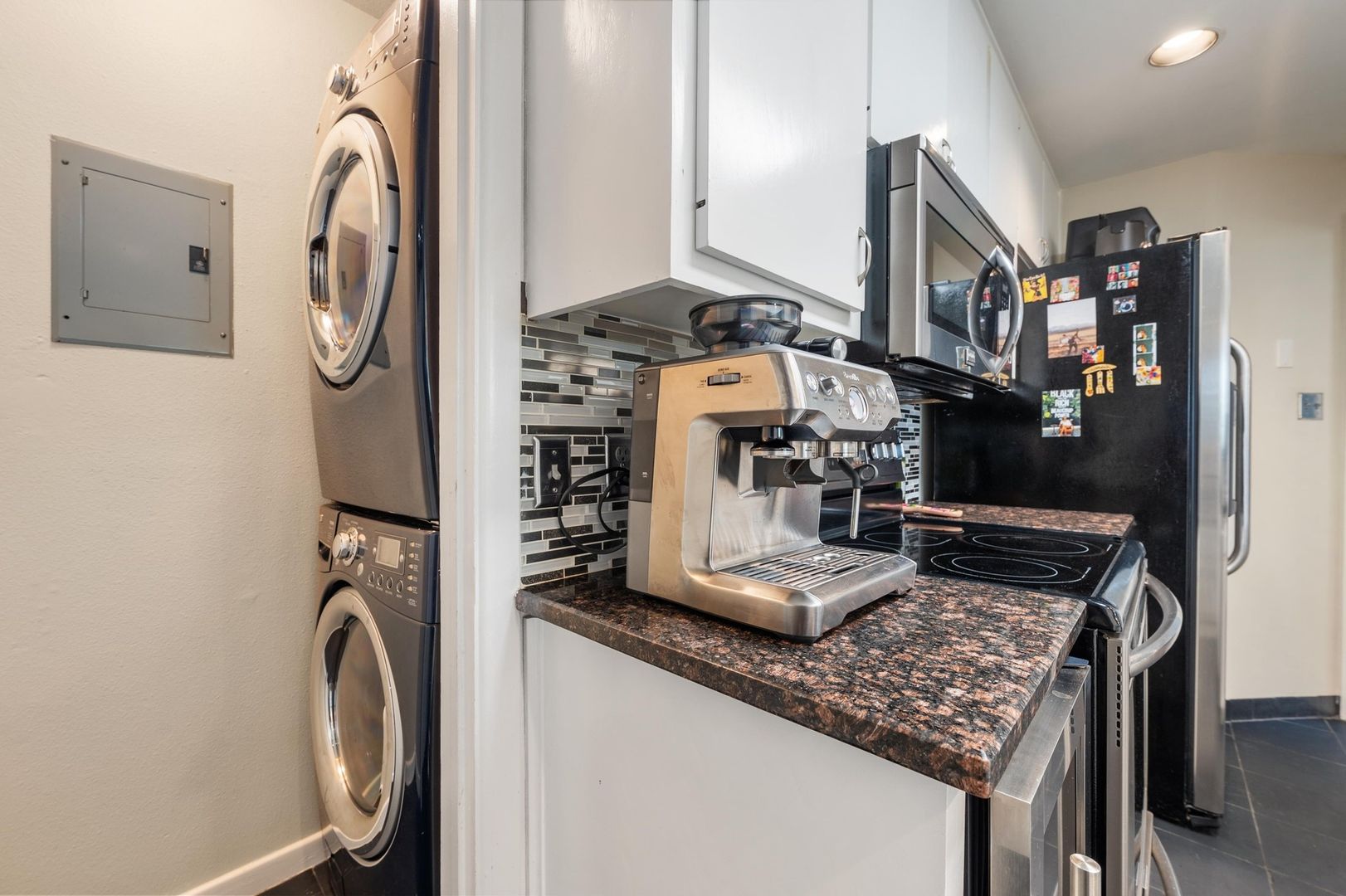 The galley-style kitchen features granite and cement countertops, stainless steel appliances, and opens into the living area. Dark wood flooring runs throughout the main spaces. Upgrades like a 30-bottle wine fridge, marble bathroom countertops, designer tile surrounding the fireplace and a bold accent mural by a local artist add personality and style. Built-in drawers and cabinets plus a back patio storage unit provide additional storage throughout.