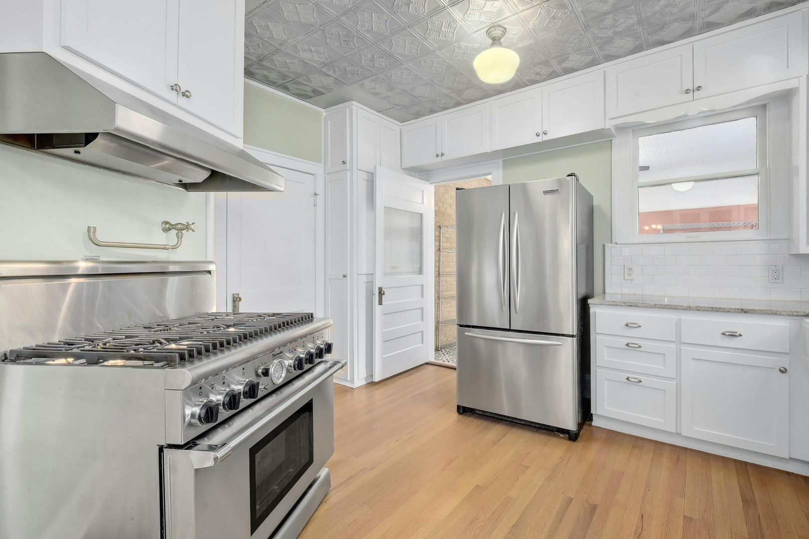 The flexible floor plan offers three bedrooms, three full baths, and three separate living areas. A rare bonus: two kitchens with white cabinetry, granite countertops, stainless-steel appliances, and a charming tin ceiling. The dining area showcases vintage china cabinets, and the primary suite opens to a second-story balcony that feels like your own private treehouse.