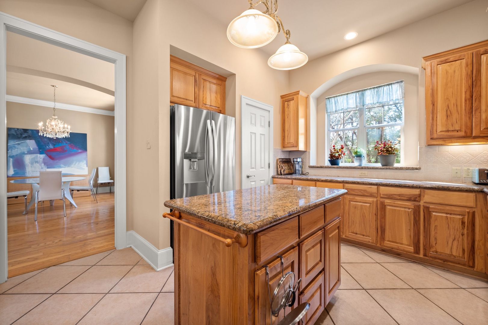 Wood floors seamlessly flow throughout the living areas, complementing the gourmet kitchen with built-in appliances, pecan cabinetry, granite countertops plus a center island.