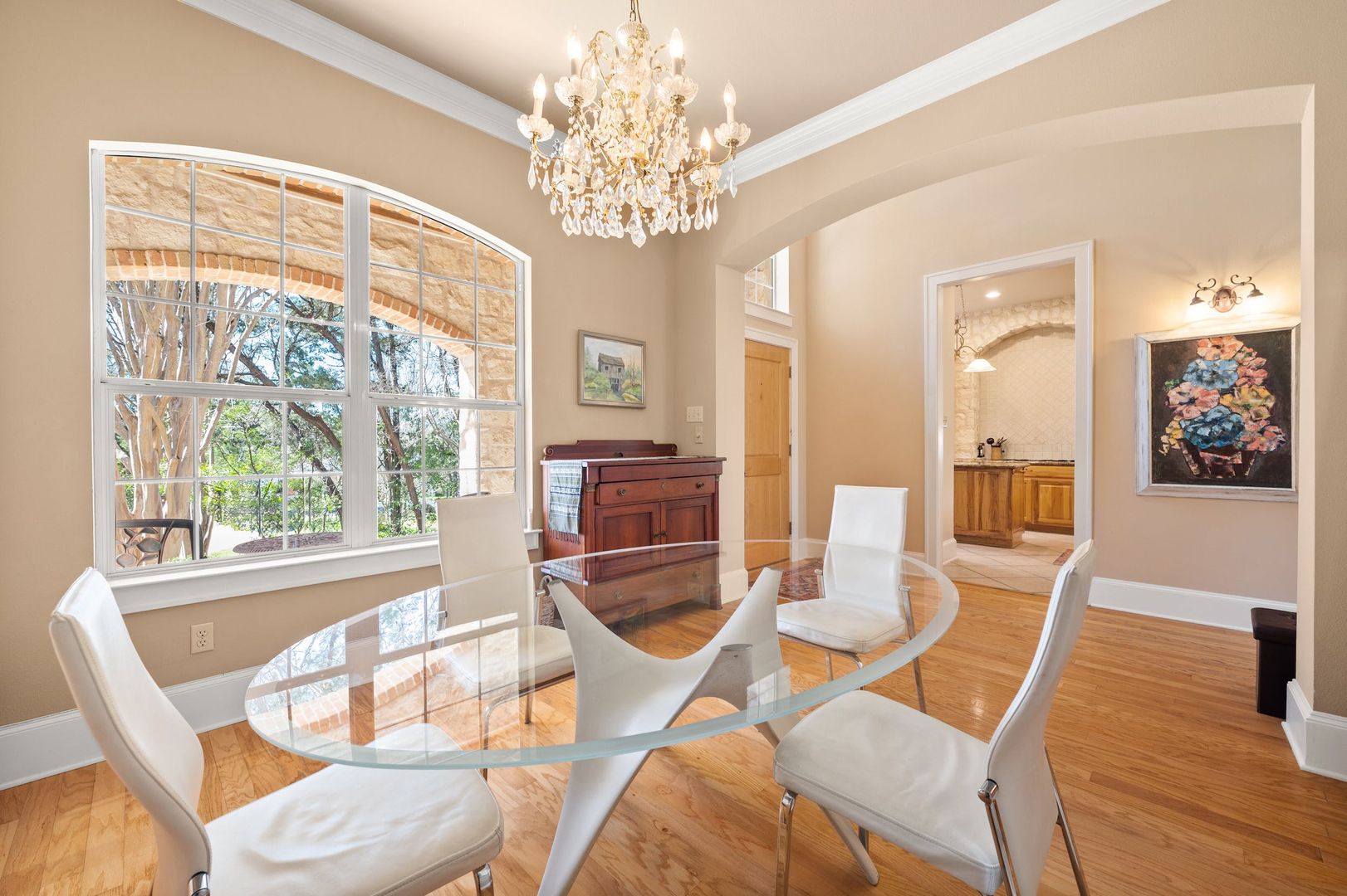 Ideal for entertaining with multiple dining and living areas. A 20' wall of windows floods the living spaces with natural light and provides a picturesque view of the lush greenbelt surrounding the home.