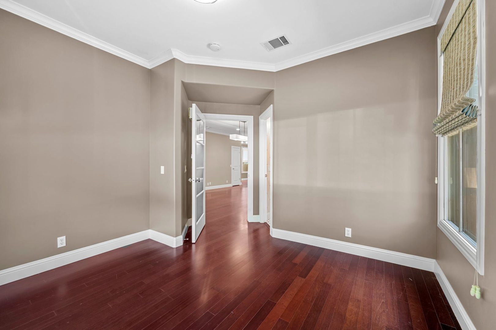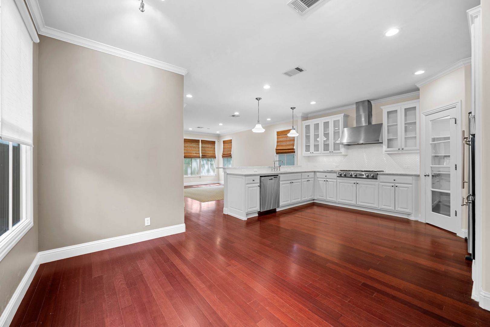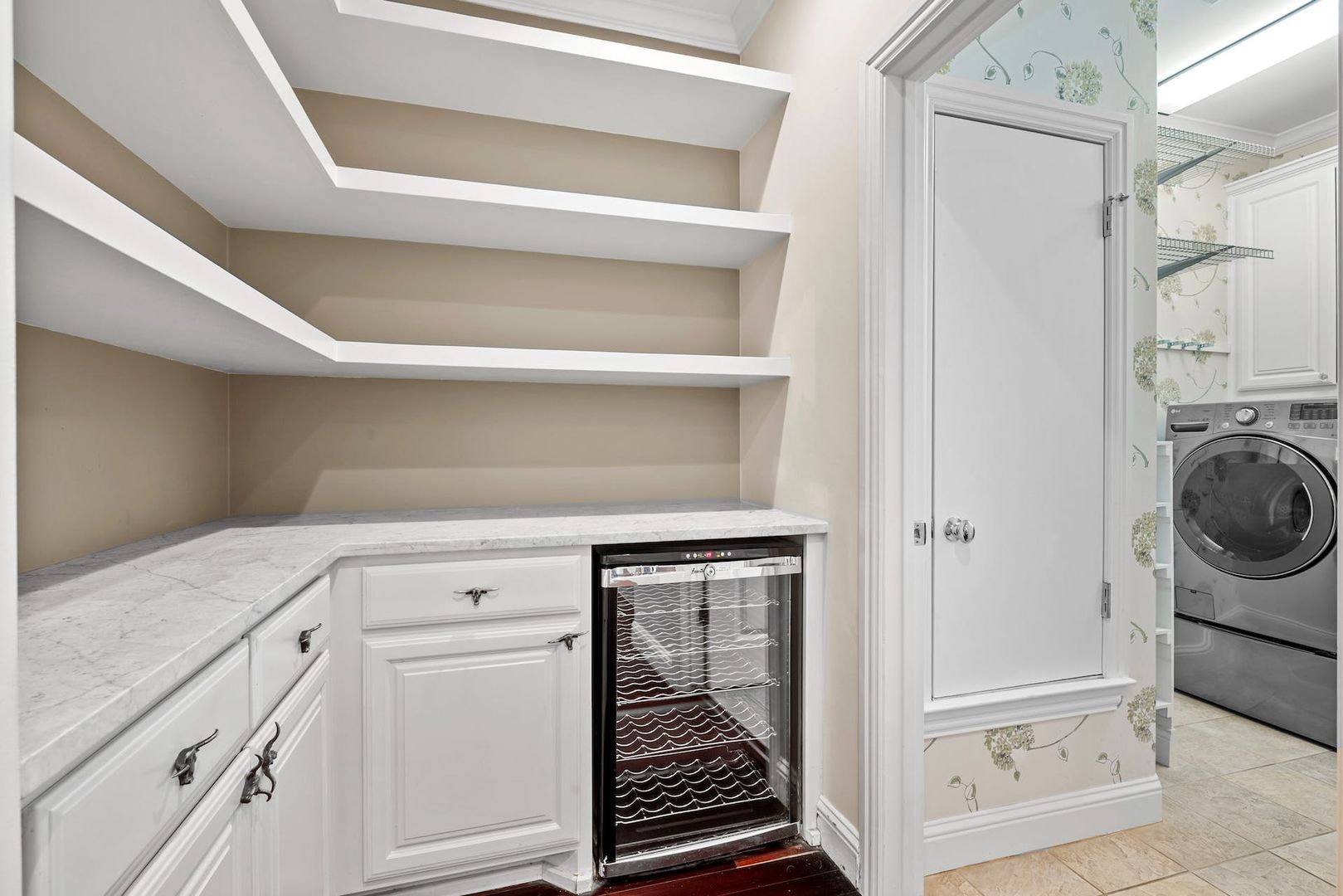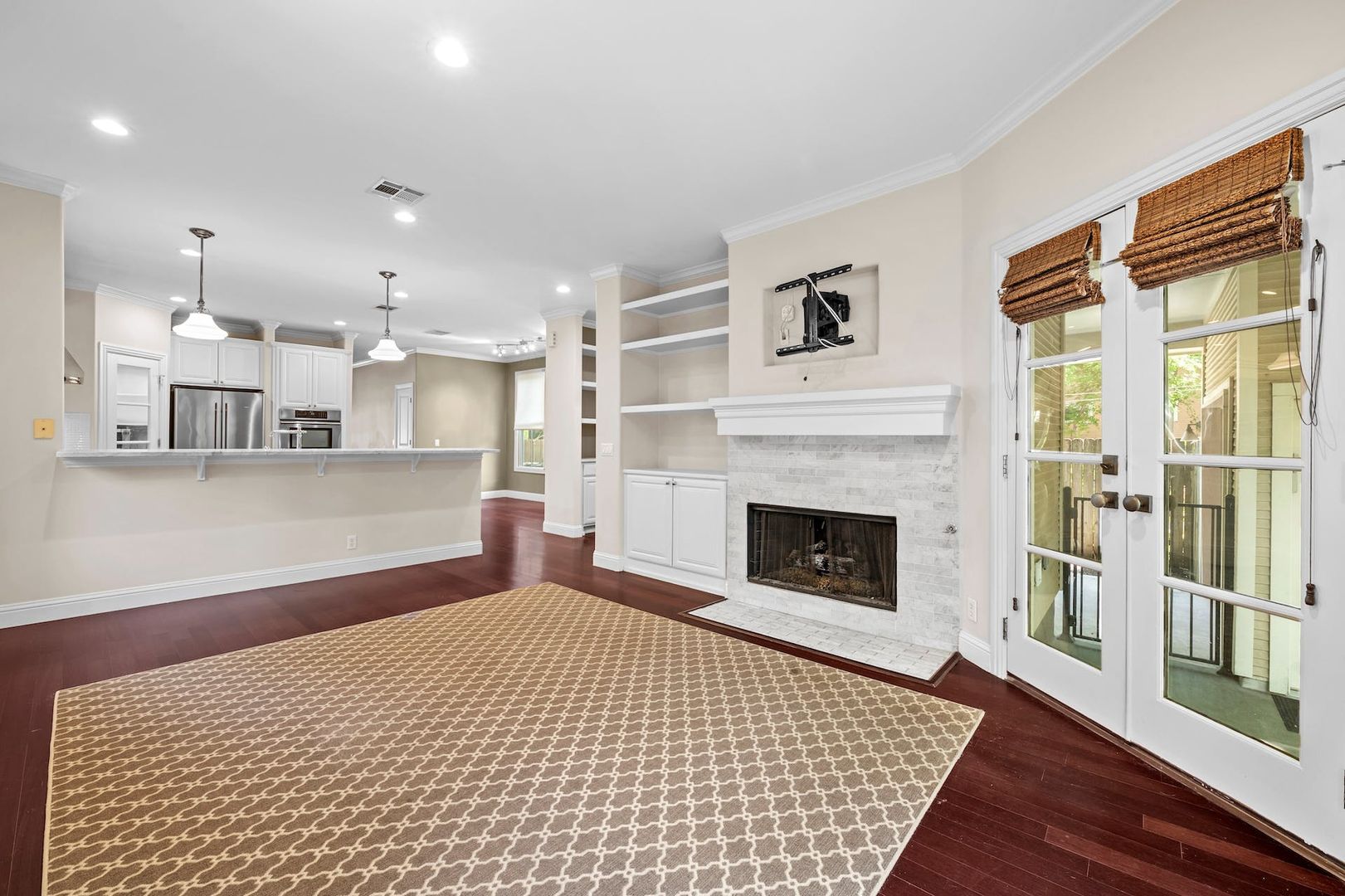 Inside, you’ll find warm wood floors, tons of natural light, and thoughtful built-ins throughout. The kitchen is both stylish and functional, featuring white glass-front cabinets, granite countertops, stainless appliances, a dedicated pantry, and a 6-burner gas range. There’s space for a breakfast table, and it opens right into a cozy living area with a fireplace, custom built-ins, and a bar setup with a wine fridge. Downstairs also includes a large laundry room, full bath, and a flexible room off the main living area that works great as an office or guest bedroom.