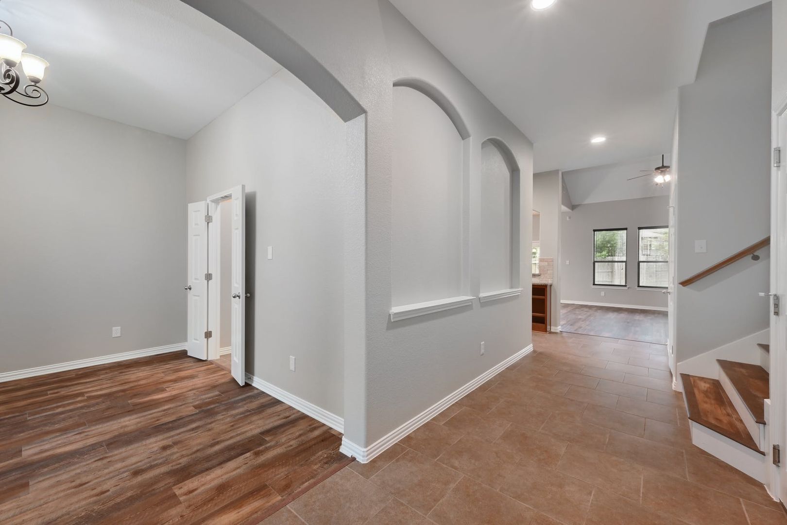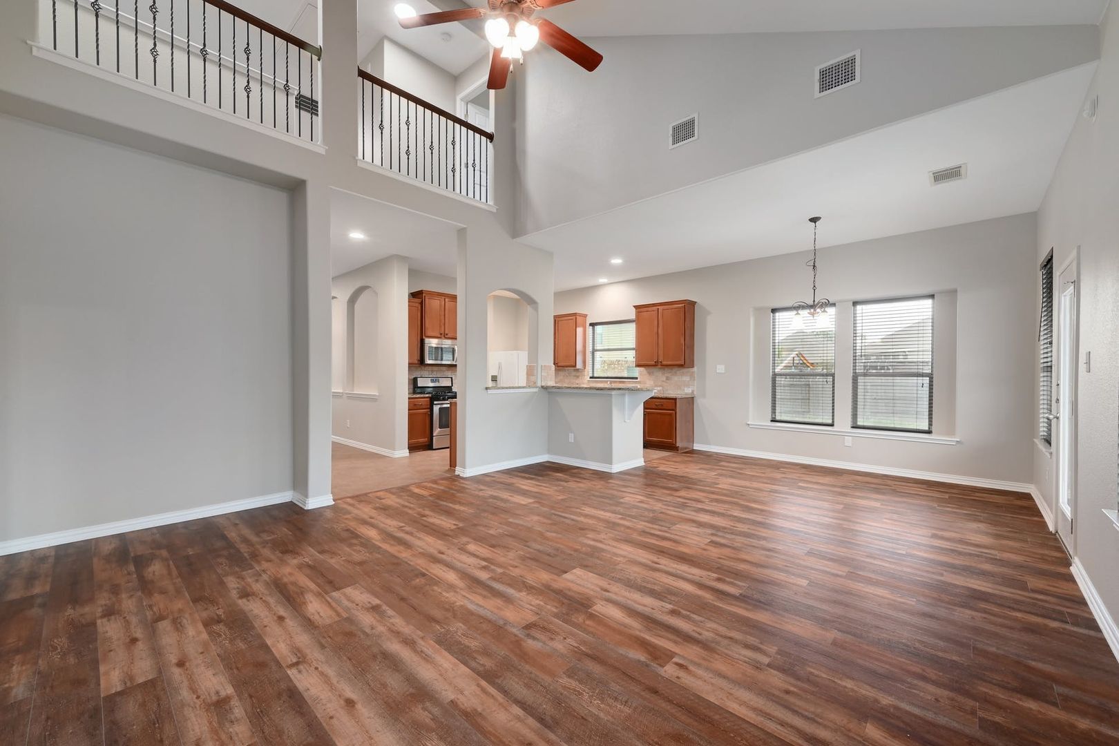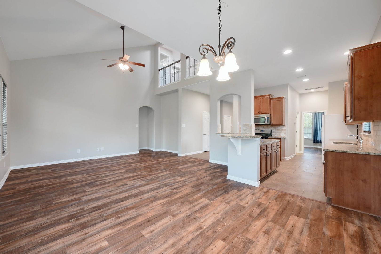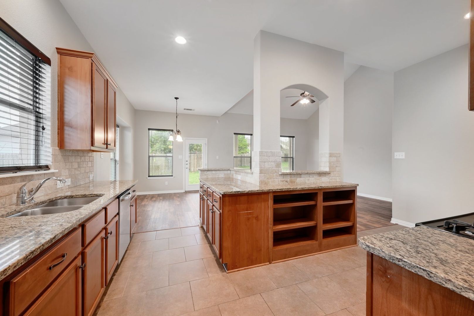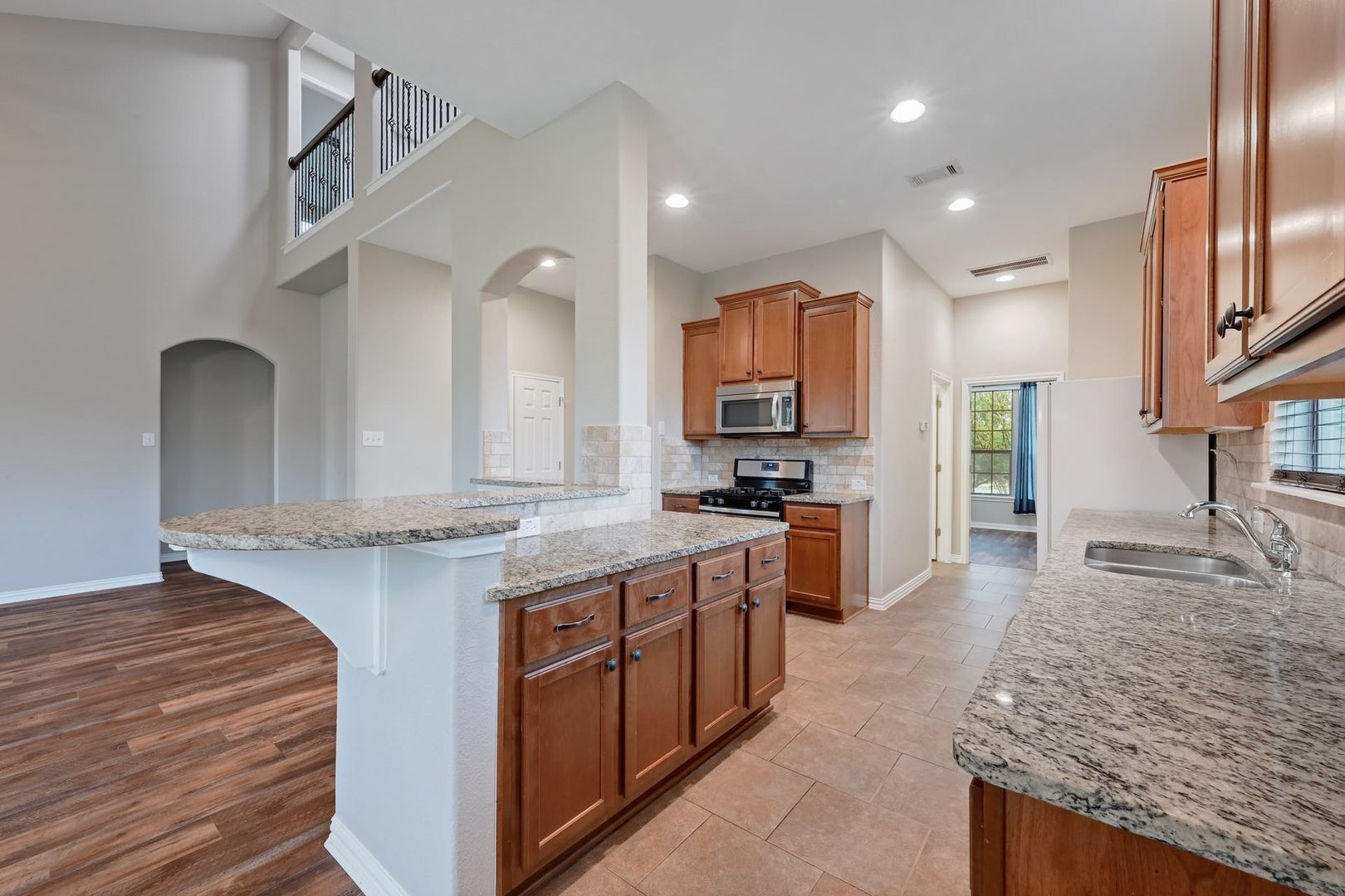 This spacious 4 bedroom, 2.5 bath home has high ceilings, large windows, and easy maintenance tile and vinyl plank flooring throughout. The kitchen includes granite countertops, a stylish backsplash and custom cabinetry with ample storage. The center island doubles as a breakfast bar for casual dining. Two separate living areas provide flexibility and tons of space to spread out.