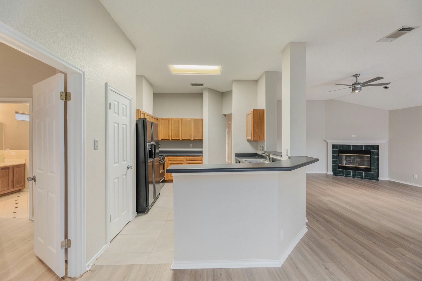 Inside discover an open floorplan with extensive natural light, high ceilings and comfortable living spaces. The heart of the home lies in the spacious open kitchen, which overlooks a large living area with a cozy fireplace. Enjoy views of the lush Texas greenbelt right from your kitchen window.